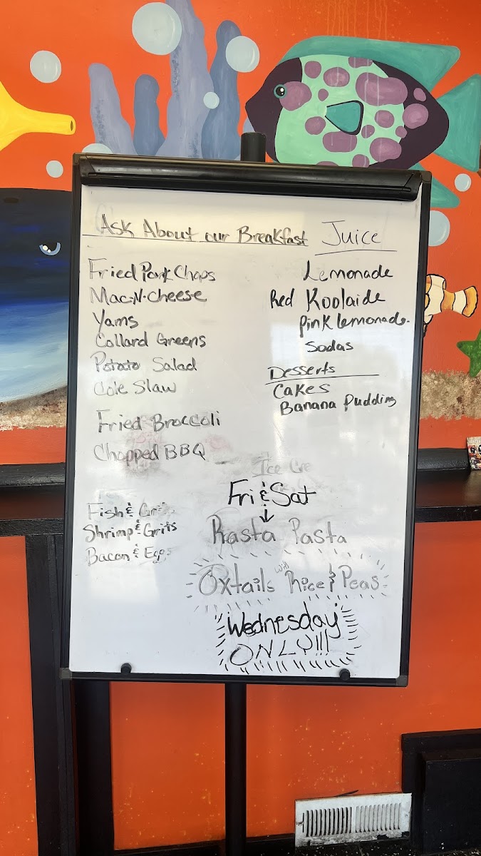 whiting or flounder, or shrimp with 2 sides, choices, Yams, collard greens, string beans, bake Mac & cheese, potato salad